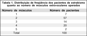 A distribuição do número de músculos extra-oculares operados em cada paciente e a freqüência de pacientes operados estão descritos na tabela 1.