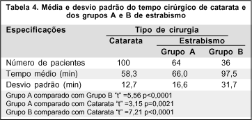 Na tabela 4 observam-se as médias dos tempos requeridos para a realização das cirurgias de catarata e de estrabismo com estratificação dos procedimentos de acordo com o número de músculos operados.