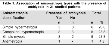 Association of anisometropia with amblyopia occurred in 10 (47.6%) cases, 8 being unilateral amblyopia and 2 bilateral amblyopia.