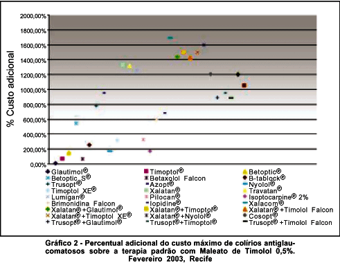 O percentual adicional do custo de drogas antiglaucomatosas relacionadas à terapia padrão variou na amostra estudada de 9,56% (Glautimol®) a 1.702,53% (Xalacom®).