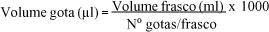 Para calcular o volume da gota, contou-se primeiramente o número de gotas e mediu-se o volume total dos 300 frascos, utilizando-se um cilindro (proveta) de 20 ml com 0,1 ml de graduação. Calculou-se o volume médio das gotas em microlitros (µl) de acordo com a seguinte operação: