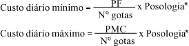 O custo por dia foi calculado dividindo-se o preço de fabricação (PF) e preço máximo ao consumidor (PMC), determinado para cada produto, pelo número de gotas por droga e multiplicando-se pelo número de gotas requeridas diariamente.