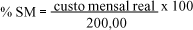 Para calcular o impacto econômico mensal em percentual do custo dos colírios relacionado ao valor do salário mínimo (SM) vigente em fevereiro 2003 (R$ 200,00), foi necessário obter a média do custo mensal real de cada produto dividindo-se o custo anual médio de fabricação e máximo ao consumidor por 12. O valor percentual foi calculado pela seguinte equação:
