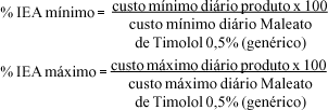Para calcular o percentual econômico adicional (IEA) dos colírios sobre o custo diário mínimo e máximo do Maleato de Timolol 0,5% (genérico), definido como terapia padrão pelo menor custo do mercado na amostra estudada, foram utilizadas as seguintes equações, respectivamente: