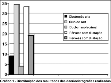 A avaliação das vias lacrimais revelou sinais de obstrução alta em 9,04%, obstrução baixa em 38,42%, sendo que em 34,46% o local da obstrução era o seio de Arlt e em 3,96%, o ducto nasolacrimal. Cerca de 33,33% dos exames evidenciaram vias lacrimais pérveas sem dilatação e 19,21%, vias pérveas e dilatadas (X2=67,72 - p<0,001) (Gráfico 1).