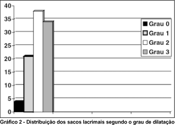 A classificação do grau de dilatação dos sacos lacrimais foi realizada em 75 do total de exames avaliados. Cerca de 4,00% tiveram o saco lacrimal grau 0, 21,33% grau 1, 38,67% grau 2, 34,67% grau 3 e 1,33% grau 4 (X2=43,87 - p<0,0001) (Gráfico 2).