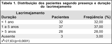 A queixa de epífora estava ausente em 3,0%. Em 32,0% a queixa estava presente há cerca de 1 ano; em 37,0% entre 1 a 5 anos e em 28,0%, há mais de 5 anos (X2=27,63 - p<0,0001) (Tabela 1).