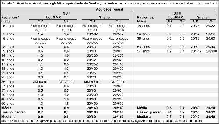 Alguns autores acreditam que pacientes portadores de RP, associados a síndrome de Usher, são considerados como cegos legais, ou seja, apresentam acuidade visual <20/200 no melhor olho, com a melhor correção óptica(12,15,19). Entretanto, estudos mais recentes descreveram que, mesmo que a doença esteja avançada, a maioria dos pacientes tem a acuidade visual preservada, isto é, acuidade visual >20/40 no melhor olho(12-13,18-19). O presente estudo confirma a acuidade visual preservada no Grupo SU II, com média de 20/50. Embora a média da acuidade visual do Grupo SU I tenha sido de 20/160, os testes estatísticos não paramétricos mostraram que não houve diferença estatística significante entre os dois grupos. Apenas um paciente com SU I obteve acuidade visual de movimentos de mão no olho esquerdo. A ocorrência de cegueira legal, como descrita anteriormente(12,18-19) não foi encontrada nos grupos estudados.