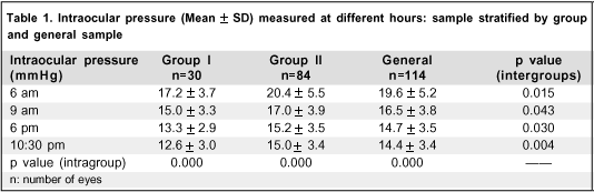 Also for IOP, the mean values decreased in the morning period with mean higher values in bed at 6 am than at other hours in both groups (Table 1).