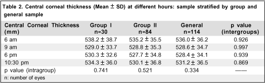 In this paper, it was seen that in suspected and glaucomatous patients, although the mean CCT in both groups has been a little higher in bed at 6 a.m. than at other hours, there was no statistically different variation among the different scheduled hours in which CCT was measured. It was also noticed that there is a mild tendency to decrease in the mean CCT of both groups in the morning period and to slight increase until the end of night (measurements at 10:30 pm) (Table 2).