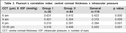 Shah et al.(8), have measured CCT and IOP of 56 eyes from 28 glaucoma suspected patients. Both parameters were measured by the same physician, using an ultrasonic pachymeter and a Goldmann tonometer, respectively, at 8 am, 12 pm, 4 pm and 8 pm. The authors found no statistically significant correlation between the daily mean variations of IOP and CCT(8). This was the only paper we found correlating CCT with the IOP measurements at different hours of the day (4 IOP and CCT measurements)(8).