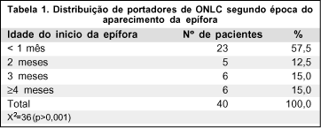 A produção de lágrimas inicia-se na primeira ou na segunda semana de vida, o que condiciona o surgimento da epífora em portadores de ONLC a esta época. Assim, a maioria das crianças desta amostra apresentavam o início da epífora em idade inferior a 1 mês. Algumas, porém, possuíam o sintoma relatado mais tardiamente. A razão que poderia explicar isso seria ser o fato da epífora ser um sintoma que não atrai muito a atenção dos pais ou não se tratar de ONLC verdadeira, mas sim, obstrução da drenagem lacrimal secundária aos processos de hipertrofia da mucosa nasal, muito freqüentes em crianças e denominadas de pseudo-obstrução(12).