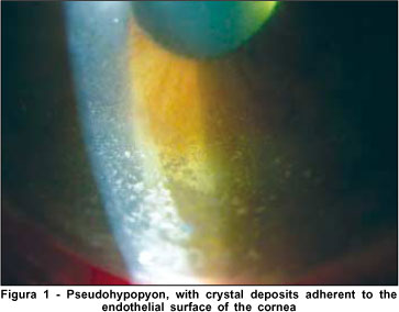 Descrição de dois casos de pacientes submetidos à injeção intravítrea de acetonida de triancinolona (AT), que desenvolveram pseudo-hipópio transitório. Um paciente apresentava edema macular diabético clinicamente significativo com componente cistóide e o outro, com descolamento seroso de retina agudo com Vogt-Koyanagi-Harada, e ambos desenvolveram pseudo-hipópio com presença de depósitos de cristais no endotélio corneano; em um caso o pseudo-hipópio desapareceu espontaneamente em 24 horas, no outro caso o pseudo-hipópio teve duração de 2 dias. O pseudo-hipópio é importante sinal que pode ser observado após injeção intravítrea de AT, em pacientes fácicos, apresentando resolução espontânea sem complicações. Este pseudo-hipópio causado por depósitos de cristais de AT deve ser considerado diagnóstico diferencial para hipópio infeccioso associado a este tipo de tratamento.
