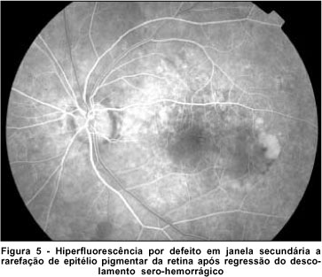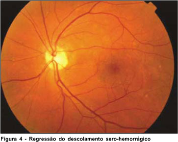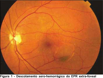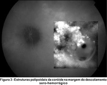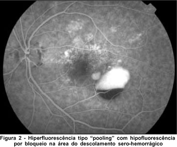 Paciente de 54 anos, sexo masculino, pardo, natural e procedente de Fortaleza, procurou nosso serviço com queixa de baixa acuidade visual súbita em olho direito (OD). Era portador de hipertensão arterial sistêmica. Ao exame oftalmológico, apresentava: acuidade visual de percepção luminosa em OD e 20/25 em olho esquerdo (OE), segmento anterior sem anormalidades e pressão intra-ocular de 12 mmHg em ambos os olhos (AO). Ao exame fundoscópico: hemorrragia vítrea em OD e em OE drusas moles em pólo posterior. Ao exame ultra-sonográfico: imagem sugestiva de hemorragia vítrea com retina aplicada. Após três meses, o paciente foi submetido a vitrectomia via pars plana (VVPP), quando foi constatada a presença de cicatriz disciforme em região macular. Paciente evoluiu com descolamento de retina e perda de visão em OD. Após cinco meses de acompanhamento, foi observado descolamento sero-hemorrágico do epitélio pigmentário da retina (EPR) em OE (Figura 1). Exame angiofluoresceinográfico: hiperfluorescência com impregnação tardia correspondendo a drusas e hiperfluorescência tipo "pooling" na área do descolamento seroso com hipofluorescência por bloqueio secundária a hemorragia (Figura 2). A indocianinografia demonstrou alterações vasculares com estruturas polipoidais na margem nasal do descolamento do epitélio pigmentário (Figura 3). Após um período de cinco meses, o paciente mostrou involução da vasculopatia em OE (Figuras 4 e 5), permanecendo com visão de 20/25.