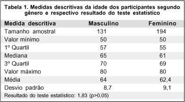 As medidas descritivas sobre a distribuição dos participantes segundo gênero e respectivo resultado estatístico estão apresentadas na tabela 1, onde se pode observar que os grupos de estudo eram homogêneos e não apresentavam diferença significativa entre os gêneros.