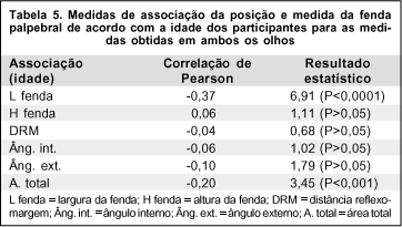 A tabela 5 mostra as medidas de associação das alterações da posição e medida da fenda palpebral para os dois olhos em conjunto, mostrando que também desta forma, houve correlação da idade com a largura da fenda e a área total.
