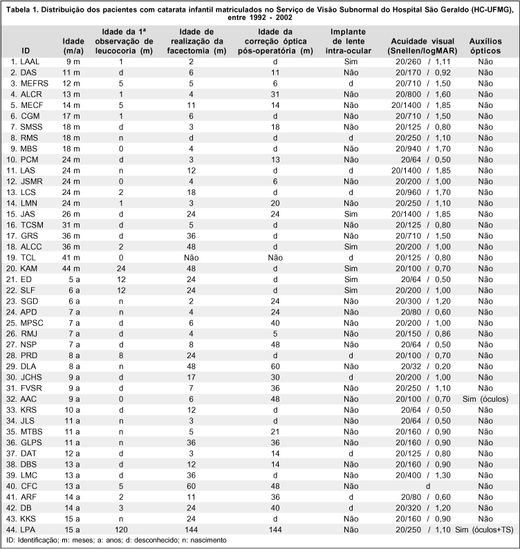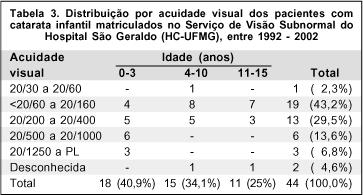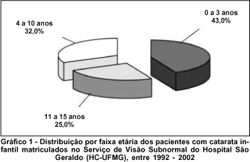 Foram analisados 65 (4,9%) prontuários com diagnóstico de catarata congênita do Serviço de Visão Subnormal do Hospital São Geraldo, de um total de 1.332 prontuários e selecionados 44 (3,3%) freqüência de catarata infantil no ambulatório de Visão Subnormal (Tabela 1). Vinte e um foram excluídos (32,3%) por apresentarem idade superior a 15 anos (81%), dados incompletos (14,3%) e catarata pós-uveíte (4,7%). A faixa etária, variou de 0 a 15 anos, sendo 19 pacientes (43,0%) de 0 a 3 anos, 14 (32,0%) de 4 a 10 anos, 11 (25,0%) de 11 a 15 anos (Gráfico 1). Dezesseis (36,4%) eram do sexo masculino e 28 (63,6%) do sexo feminino. Dezenove (43,2%) eram leucodérmicos, 8 (18,2%) feodérmicos, 2 (4,5%) melanodérmicos e 15 (34,1%) desconhecida. A primeira observação de leucocoria ocorreu em 20 pacientes (45,5%) com idade menor ou igual a 2 meses, em 4 (9,1%) de 3 a 6 meses, em 1 (2,3%) de 7 a 11 meses, em 3 (6,8%) de 12 a 48 meses, em 1 (2,3%) acima de 48 meses, o dado era desconhecido em 15 (34,0%) (Gráfico 2). A observação da leucocoria foi realizada pela mãe em 17 (38,6%) casos, pelo pai em 1 (2,3%), pela avó em 1 (2,3%), pelo pediatra em 1 (2,3%), pela tia em 1 (2,3%) e o dado era desconhecido em 23 pacientes (52,3%) (Tabela 2). A facectomia foi realizada em 42 pacientes (95,5%), sendo que em 2 (4,5%) na faixa etária menor ou igual que 2 meses, em 17 (38,6%) de 3 a 6 meses, em 4 (9,1%) de 7 a 11 meses, em 17 (38,6%) de 12 a 48 meses, em 2 (4,6%) com idade maior que 48 meses, em 1 (2,3%) paciente o dado era desconhecido e 1 (2,3%) paciente não realizou cirurgia (Gráfico 3). O implante de lente intra-ocular (LIO) foi realizado em 6 pacientes (13,6%), em 28 (63,7%) não se implantou a LIO, e em 10 (22,7%) o dado era desconhecido. A correção óptica pós-facectomia ocorreu em 4 pacientes (9,1%) com idade menor que 12 meses, em 10 (22,6%) com idade de 12 a 24 meses, em 5 (11,4%) com idade de 25 a 36 meses, em 5 (11,4%) de 37 a 48 meses, em 1 (2,3%) de 49 a 60 meses de idade, em 1 (2,3%) com idade maior que 60 meses, em 17 (38,6%) o dado era desconhecido e 1 (2,3%) paciente não realizou cirurgia (Gráfico 4). A medida da acuidade visual mostrou, na faixa etária de 0 a 3 anos, 4 pacientes (9,1%) com AV menor que 20/60 a 20/160, 5 (11,4%) de 20/200 a 20/400, 6 (13,6%) de 20/500 a 20/1000, 3 (6,8%) com AV inferior a 20/1000; na faixa etária de 4 a 10 anos, verificou-se 1 paciente (2,3%) com AV de 20/30 a 20/60, 8 (18,1%) com AV menor que 20/60 a 20/160, 5 (11,4%) de 20/200 a 20/400, 1 (2,3%) de AV desconhecida; e na faixa etária de 11 a 15 anos, 7 pacientes (15,9%) com AV menor que 20/60 a 20/160, 3 (6,8%) de 20/200 a 20/400, e 1 (2,3%) de AV desconhecida (Tabela 3). A média da AV é 20/150 (0,87 logMAR), a mediana é 20/200 (1,0 logMAR), e o desvio padrão é de ± 0,17 logMAR. Em relação à história familiar, verificou-se consangüinidade em 1 paciente (2,3%), catarata congênita em 4 (9,1%), 1 (2,3%) com hipotireoidismo, 2 (4,5%) com rubéola gestacional, 1 (2,3%) com estrabismo, e 35 (79,5%) o dado era desconhecido (Tabela 4). Ao analisar a história de doença ocular associada pós-facectomia, constatou-se 8 pacientes (18,2%) com glaucoma, 3 (6,8%) com estrabismo, 5 (11,4%) com nistagmo, 2 (4,5%) com nistagmo e estrabismo e em 26 (59,1%) o dado era desconhecido (Tabela 5). Verificou-se o uso de auxílios ópticos em 2 pacientes: em 1 deles (2,3%) utilizaram-se óculos com adição especial e no outro (2,3%) óculos e telescópio.