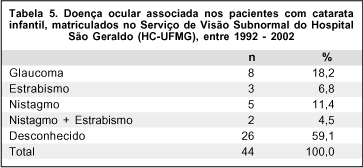 Estudos realizados em Serviços de Visão Subnormal no Brasil mostram a freqüência de catarata congênita variando de 5,8 a 13,0%(5-10). Neste estudo, a catarata infantil ocorreu em 3,3% dos casos, possivelmente pelo limite da faixa etária não referido nos trabalhos pesquisados. Segundo trabalho realizado em nosso Serviço de Visão Subnormal, encontrou-se uma freqüência de 5,8% para catarata congênita(8).