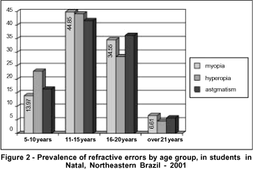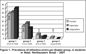The prevalence of ametropias in the literature is conflicting, mainly regarding myopia and hyperopia. According to Matsumura, myopia is the most common ocular disorder in Japan, affecting, at some ages, 65.6% of individuals(3). In Brazil, hyperopia is the most frequent refractive error in children, varying between 60 and 70%, demonstrated in studies at the Campo Grande University Hospital, between 1996 and 1998(4). Some authors, in a sample of medical students in Singapore, discovered that 82% were myopic(5-6). In Norway as well as in Greece, myopia has also been the most common refractive error(7-9).