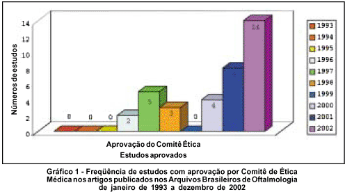 Dentre os artigos publicados, nota-se significativo e consistente aumento de aprovações por comitês de ética em pesquisa somente a partir do ano de 2000 (Gráfico 1). Tal mudança pode ser atribuída à aprovação da resolução CNS nº 196 do Código de Ética Médica, de outubro de 1996, que tornou obrigatória a apreciação, por um Comitê de Ética institucional, de qualquer pesquisa envolvendo seres humanos(21). Nota-se porém, ainda um certo desconhecimento dos autores sobre a obrigatoriedade da submissão de seus trabalhos científicos aos Comitês de Ética em Pesquisa institucionais, se levarmos em consideração o número de artigos publicados.