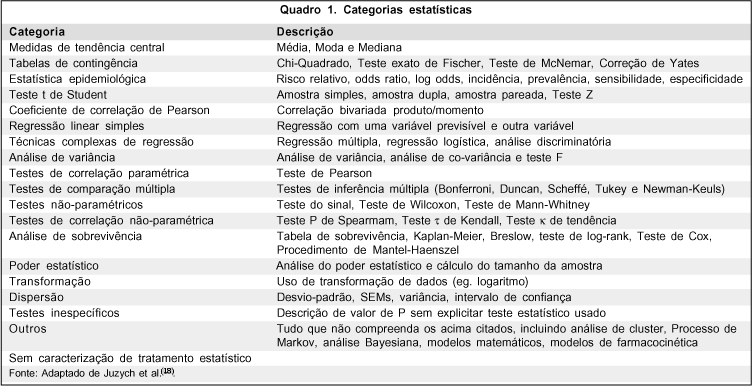 Para padronizar a tabulação dos métodos estatísticos usados e compará-los com outras publicações, utilizou-se a classificação proposta por Emerson e Colditz(14) e por Hokanson et al.(15-17), modificadas por Juzych et al.(18). As diferentes categorias sugeridas são expostas no quadro 1. Esta classificação propõe distinção entre métodos de tendência central (média, moda e mediana) e métodos de dispersão dos dados (desvio-padrão e variância). "Métodos inespecíficos" aplicam-se aos artigos que contêm frases como "estatisticamente significante" ou valor de p, sem especificar o método estatístico empregado. "Artigos sem tratamento estatístico" referem-se a estudos que não apresentem conteúdo estatístico ou apresentem somente porcentagens, contas, gráficos e/ou histograma.