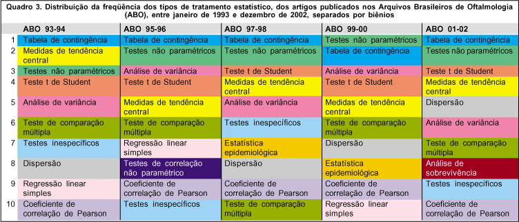Ao analisarmos os resultados de nosso estudo e compará-los com o de outra publicação(18), observamos que a distribuição dos métodos estatísticos mais freqüentemente encontrados nos ABO, nesse período, (tabelas de contingência, testes não paramétricos, teste t de Student e medidas de tendência central) difere da encontrada em revistas oftalmológicas internacionais (Quadro 4). Dentre outras possíveis razões, acreditamos ser essa diferença fruto da maior proporção de estudos clínicos descritivos (observacionais ou intervencionais) publicados nos ABO, em relação aos analíticos, com conseqüente uso de tratamento estatístico de menor nível de complexidade. A distribuição dos métodos estatísticos mostrou-se praticamente uniforme quando os resultados foram fragmentados por biênios (Quadro 3).