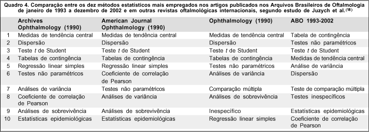 O quadro 4 mostra os dez tipos de métodos estatísticos encontrados com maior freqüência em estudos anteriores de outras revistas internacionais, comparados aos resultados aqui encontrados. Nota-se que, dentre as revistas oftalmológicas estudadas por Juzych et al.(18), as medidas de tendência central e dispersão foram as mais freqüentes, enquanto, em nosso estudo, medidas de tendência central foi a quarta mais freqüente no geral e dispersão foi a sexta.