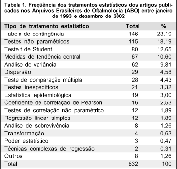 Algumas publicações já versaram sobre a freqüência e distribuição dos estudos estatísticos nos artigos de diferentes revistas científicas de diversas especialidades médicas(14-17). Juzych et al.(18) fizeram análise semelhante nas principais revistas oftalmológicas americanas (Ophthalmology, American Journal of Ophthalmology e Archives of Ophthalmology). Após extensa pesquisa bibliográfica, não encontramos estudo semelhante relacionado à literatura brasileira.
