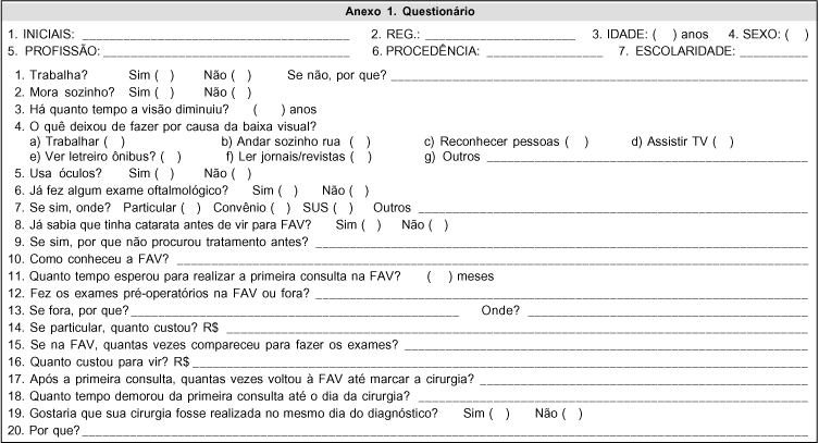Participaram deste estudo pacientes portadores de catarata senil, antes da realização da cirurgia de catarata (facectomia), na sede da Fundação Altino Ventura, entre setembro e novembro de 2002. Os pacientes responderam verbalmente a um questionário (Anexo 1) onde foram avaliados os dados quanto a gênero, idade, escolaridade, profissão, procedência, tempo de baixa visual e dificuldades em realizar tarefas do dia-a-dia pela baixa visual.
