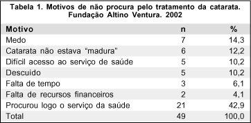Os principais motivos de não procura pelo tratamento da catarata como o medo de submeter-se à cirurgia e a falta de recursos financeiros foram similares aos de outras Instituições brasileiras(9-12). Esses fatores apontam a falta de conhecimento dos pacientes a respeito da catarata e suas condições socioeconômicas como principais obstáculos à procura pelo seu tratamento.