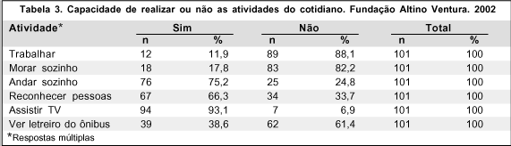 A distribuição das freqüências dos pacientes quanto à capacidade de desenvolver atividades do cotidiano está na tabela 3.