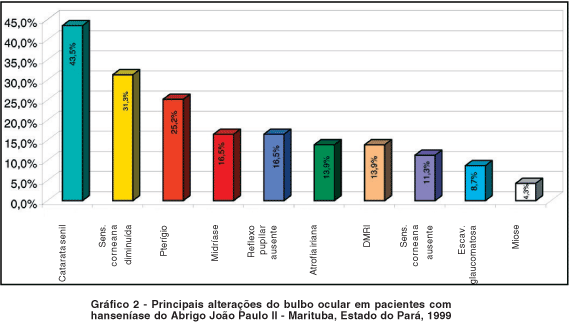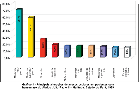 Particularmente no aparelho visual, determinam lesões tanto nos anexos oculares quanto no bulbo ocular, levando aos mais variados graus de incapacidade visual(1-4). Tais lesões são decorrentes da agressão direta ou indireta do bacilo às estruturas oculares, sendo o mecanismo indireto representado pelos processos reacionais(4). Nos anexos oculares são representadas pela madarose, triquíase, ectrópio, queda do supercílio, blefarocálases, lagoftalmo e diminuição da secreção lacrimal, ao passo que no bulbo ocular os principais achados são a alteração da sensibilidade e da transparência da córnea, ceratites, esclerites, iridociclites, dentre outras.