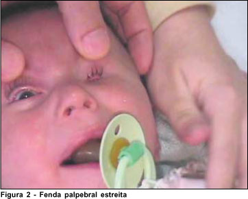O exame oftalmológico revelou olho esquerdo com órbita rasa, anoftalmia, fenda palpebral estreita com pequena abertura de ±1 mm, impossibilitando identificação das estruturas oculares (Figura 2). O exame biomicroscópico do OD apresentava córnea transparente, com diâmetro e espessura normais, câmara anterior formada, sem reação inflamatória, pupila redonda e central, catarata polar posterior 3+/4+, com 4 mm de diâmetro. A oftalmoscopia direta e indireta, realizadas sob midríase, foram prejudicadas pela opacidade dos meios.