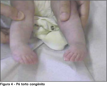 Nascido de parto cesariano, com idade gestacional de 40 semanas e baixo peso (2,0 kg); apresentava palato "em ogiva", pé torto congênito e hérnia inguinal, corrigida no 2º mês de vida (Figura 4).
