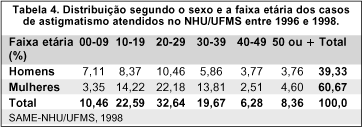 Observando a tabela 4, nota-se que as maiores percentagens de pessoas astigmatas encontram-se entre 10 e 39 anos, com concentração maior entre as idade de 20-29 anos (32,64%). Nas outras faixas observa-se pequenas diferenças de percentagem entre elas.