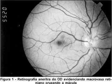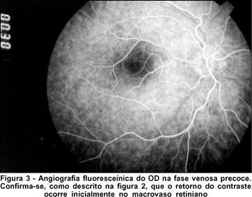 Ao exame, apresentava acuidade visual sem correção igual a 0,8 no olho direito (OD) e 1,0 no olho esquerdo (OE). Sua refração era plana em ambos os olhos (AO). O exame do segmento anterior foi normal em AO, assim com a pressão intra-ocular, igual a 14/13 mmHg. A fundoscopia revelou, em OD, macrovaso retiniano (Figura 1), com origem na veia temporal inferior, atravessando a rafe horizontal e contornando a fóvea. A angiografia fluoresceínica do OD evidenciou, na fase venosa precoce, o retorno do contraste ocorrendo inicialmente no macrovaso (Figuras 2 e 3).