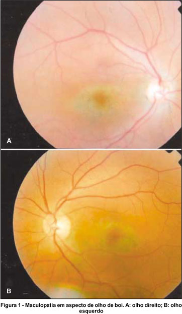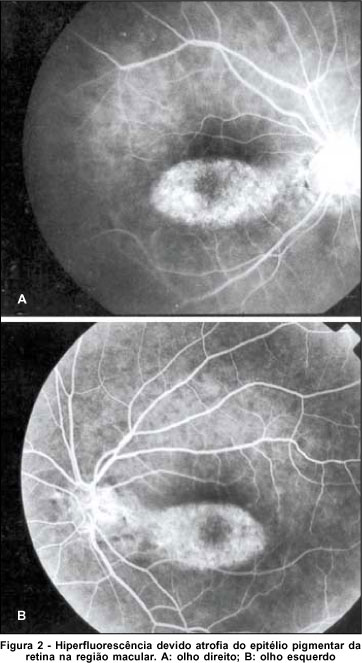 Paciente de 53 anos, sexo feminino, portadora de artrite reumatóide, fez uso de cloroquina por 6 anos e havia parado há um ano, quando veio ao nosso serviço. Apresentava acuidade visual em olho direito de 20/200 e em olho esquerdo de 20/40 sem melhora com refração. À biomicroscopia do segmento anterior apresentava lente intra-ocular no olho direito e catarata nuclear 1+/4+ no olho esquerdo, com córnea verticilata em ambos os olhos. À oftalmoscopia apresentava mácula com aspecto de tacho batido bilateral (atrofia do epitélio pigmentar da retina) (Figura 1). A angiofluoresceinografia mostrou uma área central hiperfluorescente resultado de defeito em janela do epitélio pigmentar da retina em ambos os olhos (Figura 2).