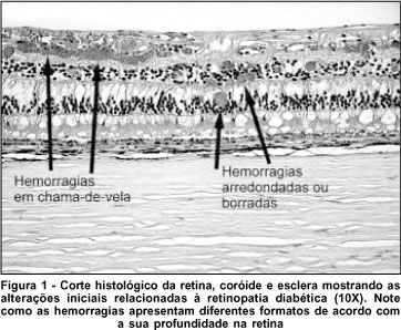 Anormalidades características da retinopatia diabética podem ser demonstradas com uma técnica especializada de histopatologia chamada digestão retiniana com tripsina descrita inicialmente por Cogan e Kuwabara(18). A enzima tripsina é usada para digerir as células da retina e os vasos sangüíneos são poupados devido a sua membrana basal que não é digerível. Os vasos sangüíneos são montados numa preparação plana e podem ser examinados diretamente após coloração com PAS (ácido periódico Schiff) que cora membrana basal(7,18). Os capilares retinianos normais são compostos por células endoteliais que revestem o capilar e células murais ou pericitos localizados na cápsula da membrana basal perivascular. Os pericitos são células contráteis que regulam o calibre vascular e o fluxo da microcirculação retiniana. Normalmente existe uma célula endotelial para cada pericito no leito capilar da retina humana(18). Pericitos são perdidos especialmente nas fases iniciais da retinopatia diabética(7,19).