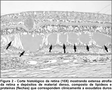 O edema retiniano e os exsudatos encontrados na retinopatia diabética de fundo refletem a quebra da barreira hemato-retiniana. Estudos de fluorofotometria do vítreo mostraram que a quebra da barreira hemato-retiniana é uma das lesões funcionais mais precoces em olhos diabéticos(16). Essa barreira protege os delicados tecidos neurais (fotorreceptores), da mesma forma que a barreira hemato-encefálica, da sobrecarga osmótica de um ambiente com excesso de líquido(3,16). As aderências juncionais das células endoteliais dos vasos retinianos constituem a parte interna ou intra-retiniana dessa barreira o que impede o extravazamento de fluoresceína dos vasos retinianos saudáveis. O epitélio pigmentar da retina forma a parte externa dessa barreira pela firme aderência de guirlanda de barras terminais no ápice de suas células. Os coriocapilares que nutrem o terço avascular externo da retina são fenestrados e vazam fluoresceína profusamente. Devido a esta característica, o epitélio pigmentar da retina serve como barreira e proteção para a retina externa desse influxo de líquido. A incompetência da barreira hemato-retiniana permite o acesso de fluido rico em lipídeos e proteína ao parênquima retiniano causando edema e exsudação(17). Na histopatologia, os exsudatos duros, amarelados e com aspecto de cera que caracterizam o diabetes mellitus se apresentam como coleções eosinofílicas de fluido protéico (vide flechas). Os exsudatos costumam se formar na camada plexiforme externa, uma região susceptível entre as duas fontes de suprimento sangüíneo da retina(7,17).