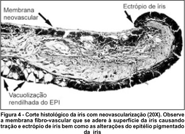 Olhos com retinopatia diabética proliferativa também são susceptíveis a neovascularização de íris e glaucoma neovascular(23). Estudos realizados sobre a concentração do VEGF no vítreo e aquoso de olhos de pacientes diabéticos revelaram que os níveis desse fator estavam sempre mais altos no vítreo. Tal fato explica porque a neovascularização de íris se inicia a partir da borda pupilar e ângulo onde a difusão do VEGF a partir do vítreo seria maior. Os neovasos proliferam sobre a superfície normal e avascular da íris aplanando e achatando sua arquitetura normal. Ocorre a formação de aderências permanentes entre a periferia da íris e o trabeculado, chamadas sinéquias anteriores periféricas. Miofibroblastos se proliferam, acompanhando os neovasos e consequentemente fornecendo os motivos para o fechamento angular e o desenvolvimento do ectrópio do esfíncter e do epitélio pigmentar da íris(7,23). Alguns pacientes com diabetes apresentam uma forma mais branda de iridopatia, chamada vacuolização rendilhada do epitélio pigmentar da íris(24). Essa vacuolização rendilhada é causada pelo acúmulo de glicogênio nos espaços cistóides do epitélio pigmentar da íris e ocorre somente em diabéticos, o que sugere sua relação com altos níveis de glicose sérica. A glicogênese focal do epitélio pigmentar da íris deve ser análoga ao acúmulo de glicogênio no túbulos renais conhecida como nefropatia glicogênica de Armanni-Ebstein(24). O dano tecidual causado pela vacuolização rendilhada deve ser responsável pela dispersão pigmentar do humor aquoso durante o intra-operatório de alguns olhos diabéticos. Essa vacuolização rendilhada pode ser evidenciada clinicamente como um padrão "roído de traça" na transiluminação ou biomicroscopia da íris(24).