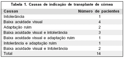Dos 27 olhos em que foi tentada adaptação, em 14 (51%) foi possível adaptar a lente de contato em: 1 (3%) foi indicado uso de óculos e em 12 (44%) foi indicado transplante penetrante de córnea. Os motivos que levaram a indicação do transplante foram: piora no quadro clínico com baixa da acuidade visual e intolerância ao uso de lente de contato ou adaptação inadequada. A indicação para transplante penetrante de córnea ocorreu em um período de 2 a 6 meses de evolução, sendo em todos os casos por piora da tolerância (Tabela 1).