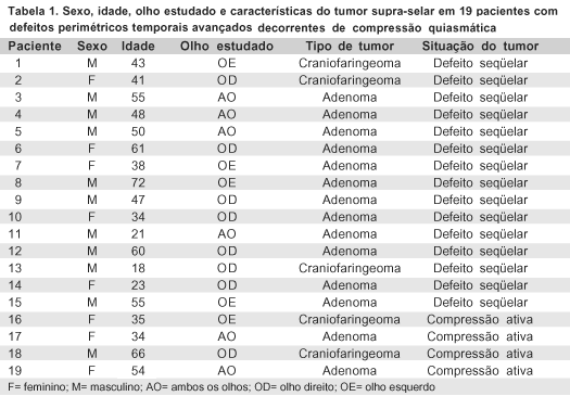 Oito pacientes eram do sexo feminino e 11 do masculino com idade variando de 18 a 72 anos, com média de 45,00±15,22 anos (média±desvio padrão). Quanto ao tipo de tumor, 14 eram portadores de adenoma hipofisário e 5 de craniofaringioma. No que diz respeito à situação do tumor, 4 pacientes apresentavam compressão ativa e 15 pacientes apresentavam defeito seqüelar. A tabela 1 demonstra os dados referentes ao sexo, à idade, ao olho estudado, ao tipo e à situação do tumor. A tabela 2 mostra os achados na perimetria computadorizada e manual.