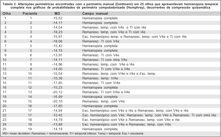 Vinte e cinco olhos foram selecionados para análise. As perimetrias computadorizadas foram analisadas quanto ao valor do "mean deviation" (fornecido automaticamente pelo aparelho) e quanto às características gráficas observadas no hemicampo temporal, tanto nos gráficos de probabilidades "total deviation" e "pattern deviation" como também no gráfico em tons de cinza. A seguir, foi avaliada a perimetria de Goldmann, com a finalidade de se verificar a presença ou não de visão remanescente do setor temporal do campo visual.