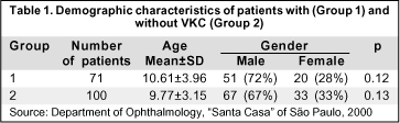 Vernal keratoconjunctivitis (VKC) is a chronic allergic disease, with seasonal periods of exacerbation, predominantly observed in children and youngsters, inhabitants of hot and dry climates such as The Middle East, North Africa and parts of South America, being rare in North Europe and North America, where it seems to be of a milder clinical presentation(1). Although it often presents as a relatively benign and self-limited condition, VKC has the potential to induce serious visual changes, not only as result of the disease itself, but also due to the complications associated with its evolution and management. Long standing disease and disabling lesion such as corneal ectasia have been reported descriptively as a complication of severe and prolonged VKC(2). Chronic ocular trauma could be the environmental factor ("trigger") associated with keratoconus development in genetically predisposed individuals. Data from the literature suggest that the prolonged, slow release of small amounts of degradative enzymes induced by chronic corneal epithelial trauma could cause tissue damage(3-5).