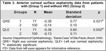 Data obtained by the topographic analysis of the corneal anterior surface of both groups clearly demonstrated that patients with VKC presented corneal contour changes when compared to patients with normal corneal asphericity. Of evident clinical interest, is the fact that the mean anterior corneal curvature of patients with VKC was more accentuated than in the control group (p<0.05). The parameters that verify anterior corneal contour such as AK and ERP, presented significantly higher values in patients with VKC (p<0.05). Previous studies on human ocular development demonstrated that mean keratometric values of normal individuals, from the age of less than 3 years to adult life, are 43.00 to 44.00 D, with minimal, if any, changes during lifetime(14-15).