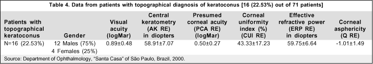 Of the patients with keratoconus diagnosed by topographic pattern (16 of 71 patients or 22.53%), 12 (75%) were males and 4 (25%) were female. Mean age was of 13.9±4.3 years. The patients in these groups presented VA of 0.89±0.48 LogMar in the right eye, average simulated keratometry (AK) of 58.91± 7.07 diopters, presumed corneal acuity (PCA) of 0.50±0.27, corneal uniformity index (CUI) of 43.33±17.23, effective refractive power (ERP) of 59.75±6.64 diopters and corneal asphericity (Q) of -1.01±1.49.