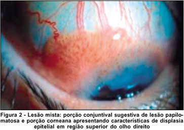 Neste estudo, foi possível observar a discordância entre os métodos citológico e histopatológico em três casos (13, 17, 28), como pode ser observado na tabela 1. Estes resultados podem ser atribuídos a alguns fatores, como: erro de avaliação do tipo citológico encontrado; dificuldade de obtenção do material, devido à menor descamação do epitélio conjuntival, quando comparado ao da cérvice uterina, o que pode fazer com que determinada amostra não represente integralmente a lesão; pode-se citar ainda as dificuldades na fixação e na coloração do esfregaço(4). A região onde foi realizado o raspado também pode ser responsável por erros na interpretação diagnóstica, já que é freqüente a presença de displasia na margem corneana de um carcinoma espinocelular. No caso 13, por exemplo, foi possível evidenciar tanto pelo exame biomicroscópico, como pela histopatologia, que se tratava de uma lesão claramente mista: porção conjuntival sugestiva de lesão papilomatosa e porção corneana apresentando características de displasia epitelial. No entanto, o resultado da citologia evidenciou uma lesão benigna (hiperplasia epitelial). É possível que neste caso especificamente o local onde foi realizado o raspado tenha influenciado diretamente no resultado falso-negativo (Figura 2). Esse problema pode ser resolvido através da realização de um maior número de colheitas, o que levaria a um aumento na porcentagem de acertos(4). Em casos de dúvida diagnóstica, a citologia permite ainda um novo estudo, na mesma lesão, sem que ocorram alterações decorrentes do primeiro procedimento(4-5).