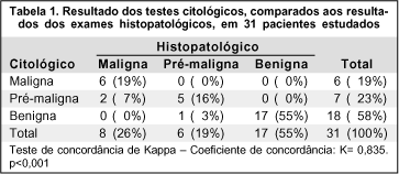 Entre as 8 lesões classificadas como malignas pelo exame histopatológico, 6 foram classificadas da mesma forma (Figura 1) e 2 como lesões pré-cancerosas, pelo método citológico. Das 6 lesões classificadas como pré-cancerosas pelo exame histopatológico, 5 foram classificadas da mesma forma e 1 como lesão benigna pelo método citológico (Figura 2). Todas as lesões classificadas como benignas pelo exame histopatológico, foram classificadas da mesma forma pelo método citológico (Figura 3). Existiu uma forte concordância entre exame citológico e o histopatológico, sendo o coeficiente de concordância de kappa de 0,835. A distribuição das freqüências dos diagnósticos citológicos e histopatológicos está na tabela 1.