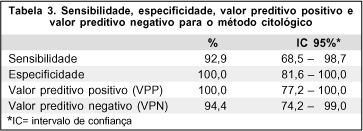 O cálculo dos parâmetros de sensibilidade, especificidade, valor preditivo positivo (VPP) e valor preditivo negativo (VPN), foi realizado segundo a distribuição dos resultados. Obtiveram-se os seguintes resultados: sensibilidade (92,9%); especificidade (100%); VPP (100%); VPN (94,4%) (Tabela 3).