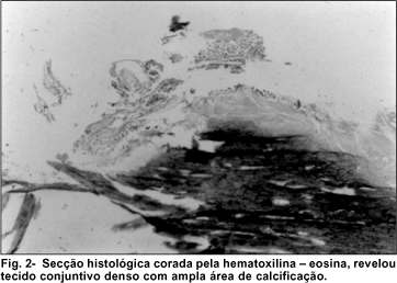 O estudo histopatológico do material ressecado revelou presença de tecido conjuntivo fibroso denso, com extensa área central de calcificação (Fig.2).
